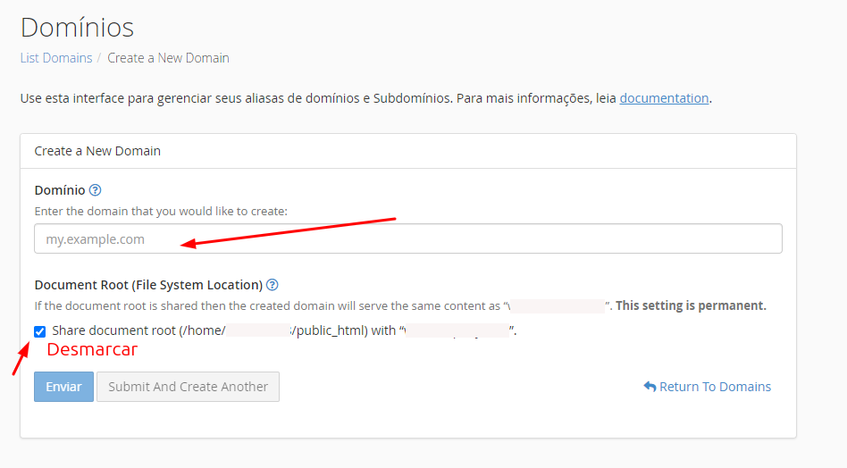 Passo 3 -> Escrever o domínio sem https:// e desmarcar a opção "Share Document" para ficar independente dos demais domínios. Clica em "Enviar".