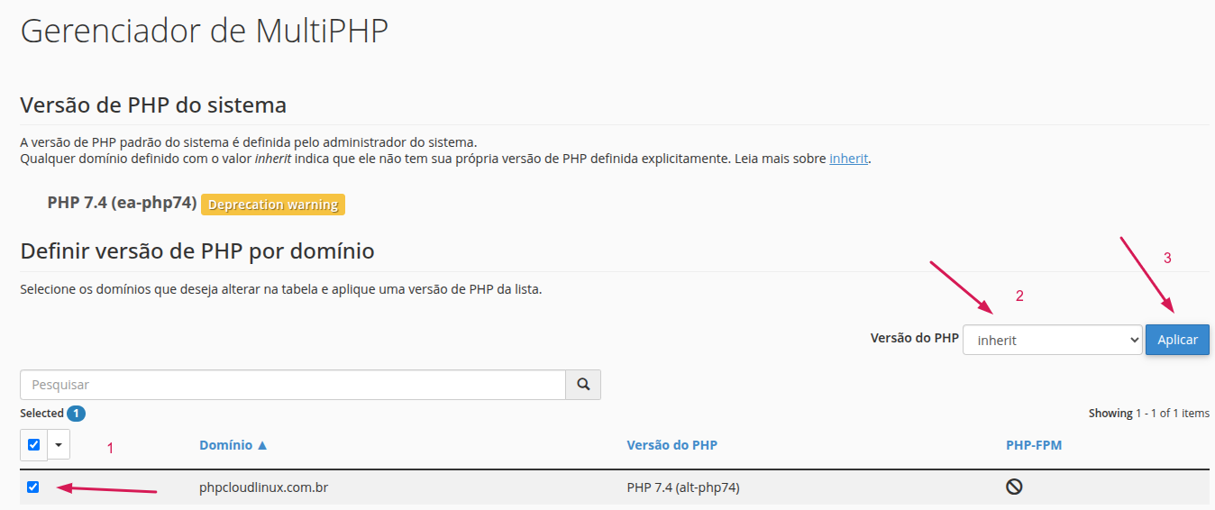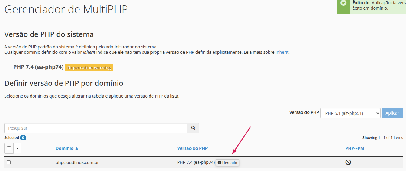 Versão PHP ficará com status de "Herdado"