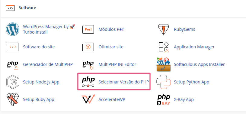 Na tela principal do "cPanel", seção, "Software", clica em "Selecionar Versão PHP"