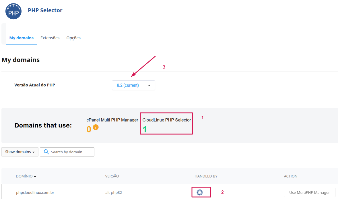 Conforme itens 1 e 2, o domínio já tem o "PHP" gerenciado pelo "Cloudlinux"